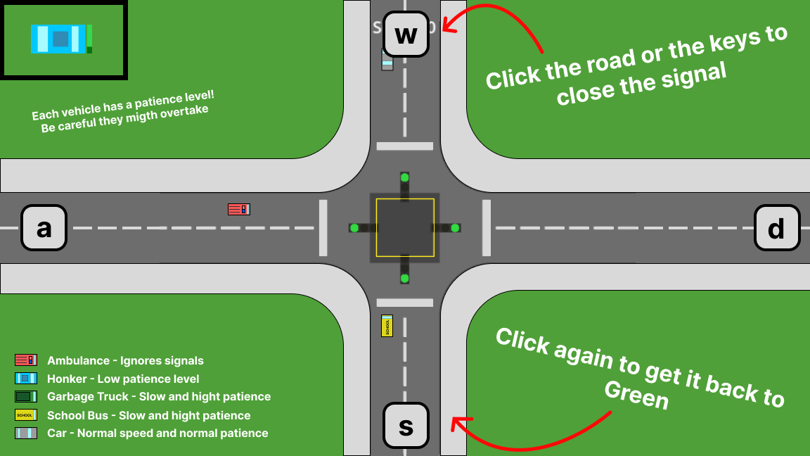 Click the road or use A, W, S, D for the respective traffic sinal.
